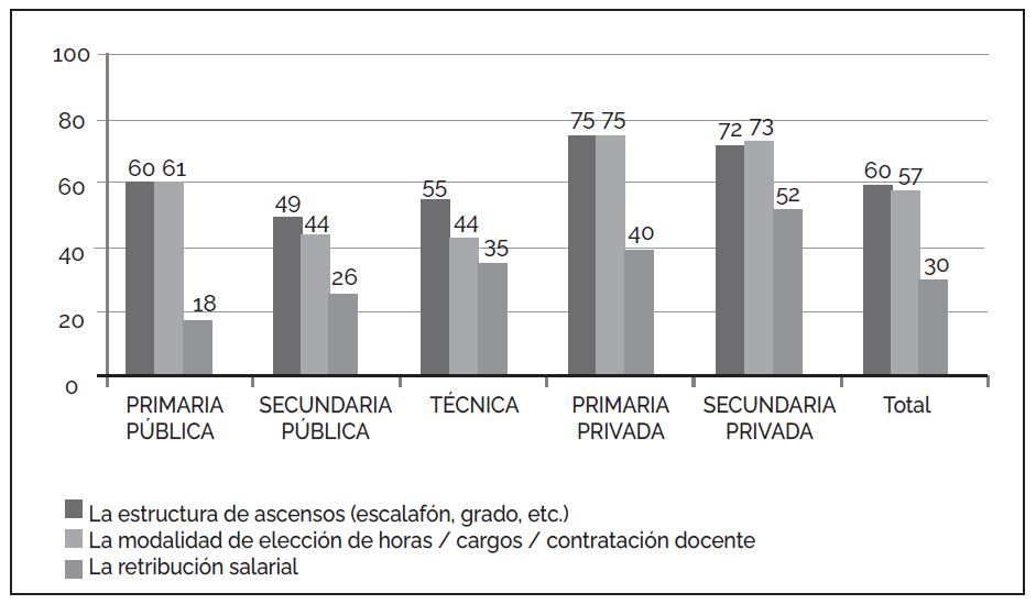 A partir de los datos analizados es posible aportar evidencia sobre tres aspectos de la gestión educativa que se vinculan con el reconocimiento institucional: el salario, la estructura de ascensos y los criterios para elegir horas en los centros educativos.
