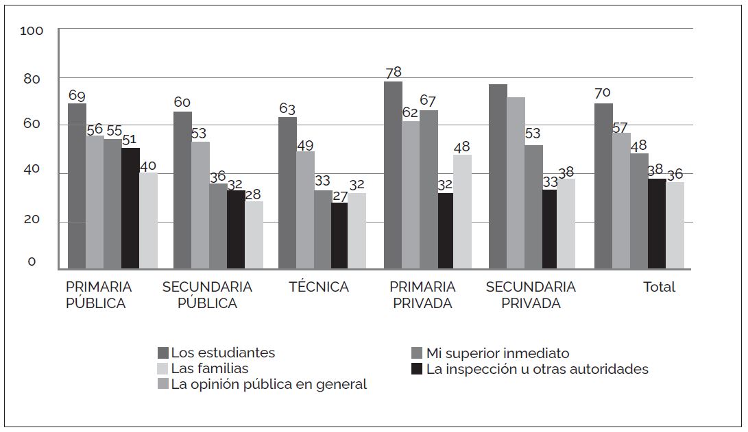 En términos generales, los docentes no perciben que esta sea una fuente de reconocimiento. Esta situación varía desde el 48 % en primaria privada, 40 % en primaria pública, 38 % en secundaria privada, 32 % en enseñanza técnica y 28 % en secundaria pública (Figura 1).