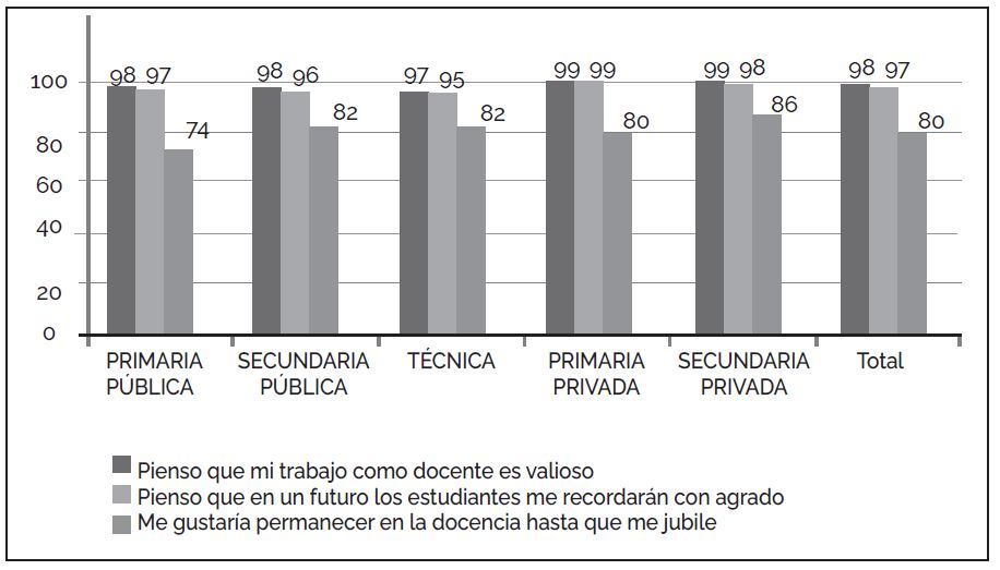 Se destaca que los docentes se sienten escasamente reconocidos por la opinión pública. Esto se encuentra en sintonía con las percepciones negativas que tiene la opinión pública acerca de los docentes (Instituto Nacional de Evaluación Educativa, 2017b). En tal sentido, parece consolidarse un diagnóstico sobre el bajo reconocimiento público de la profesión docente.