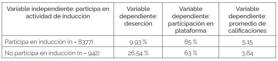 Tabla 4: Datos de participación en inducción y variables dependientes