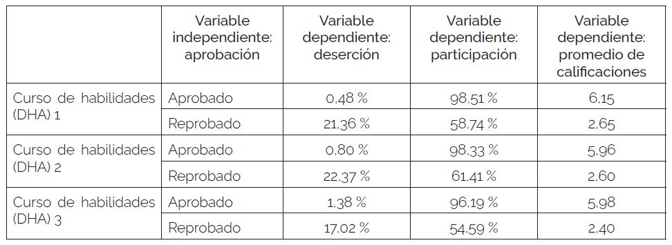 Tabla 3: Datos de la variable “aprobación de los cursos de habilidades básicas” y variables dependientes