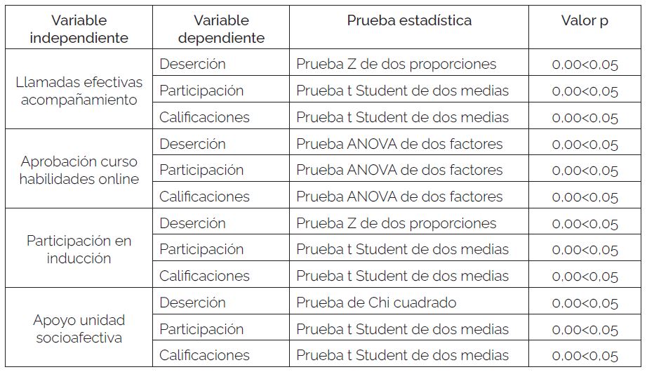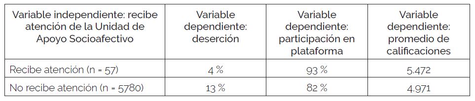 En el caso de este estudio, se midió la influencia de la variable atención de la Unidad de Apoyo Socioafectiva con relación a la deserción académica, participación en la plataforma virtual de aprendizaje y la mejora de las calificaciones (Tabla 5).
