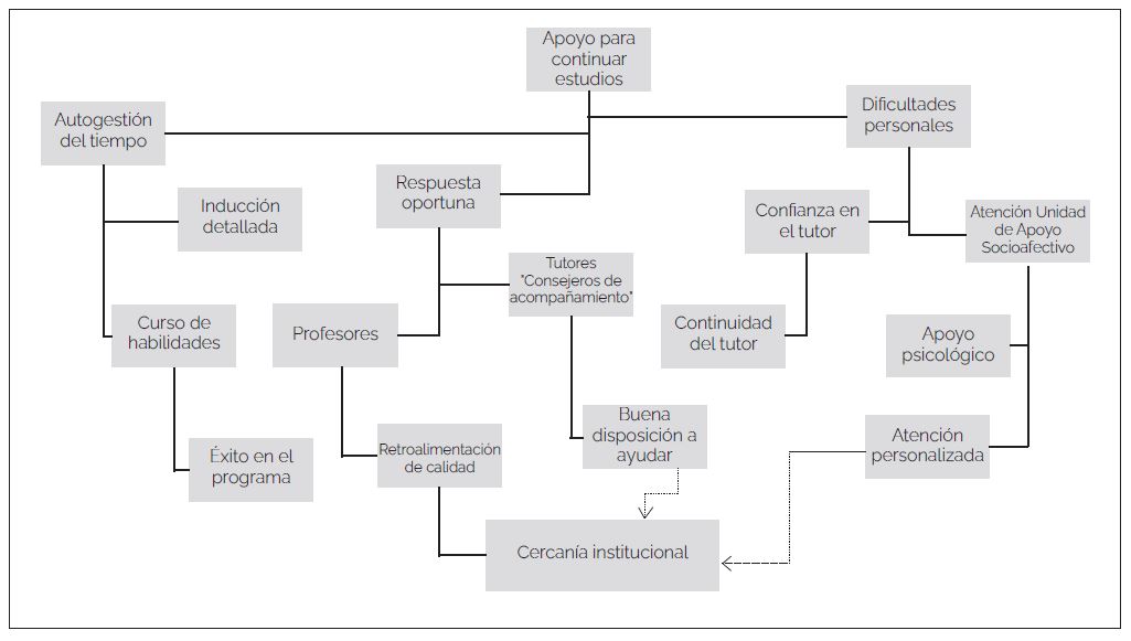 Por último, a partir de los relatos obtenidos en las entrevistas, es claro el valor que los estudiantes le atribuyen a la comunicación efectiva con docentes y tutores de acompañamiento, lo que seguramente ayuda a mitigar la sensación de aislamiento que puede presentarse en programas de esta modalidad (Armstrong et al., 2018; Muljana y Luo, 2019), así como el valor de la atención de la Unidad de Apoyo Socioafectiva, que les ayudó a lidiar con sus emociones frente a situaciones de alta complejidad para continuar sus estudios (Arguedas et al., 2016; Choi y Kim, 2018). Se constituye como un valor el contar con distintas áreas que se comunican rápidamente con los alumnos, para apoyarlos frente a las dificultades que se les presenten en los distintos ámbitos. Los estudiantes son claros en reconocer la importancia que ha tenido para ellos sentir que estos apoyos están presentes, justo en los momentos en que valoraban la posibilidad de desertar.