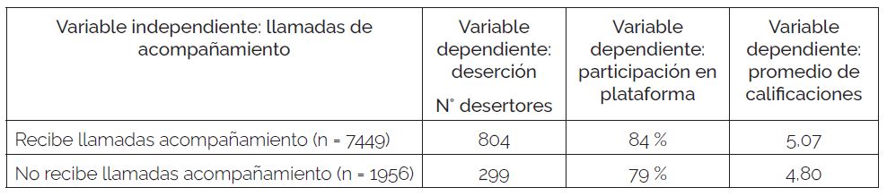 La comparación de la variable llamadas de acompañamiento (variable independiente) y deserción (variable dependiente) permitió probar la existencia de diferencias significativas en el porcentaje de deserción entre el grupo que recibió llamadas y el que no. El n total corresponde a 9.405 estudiantes de primer año, del cual 1.956 corresponde al grupo que no recibió llamados de acompañamiento (con 299 desertores) y 7.449 corresponden al grupo que sí recibió llamadas de acompañamiento (con 804 desertores). Luego se procedió a la aplicación de una prueba de intervalo de confianza para la diferencia de las dos proporciones, estimación de diferencia y prueba z.