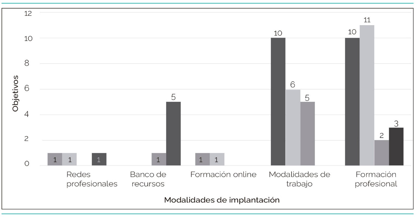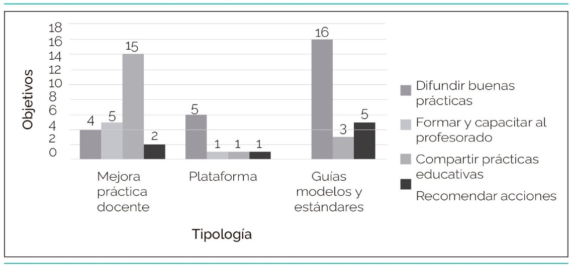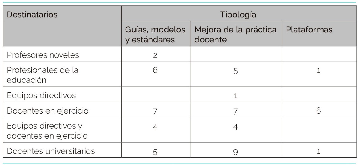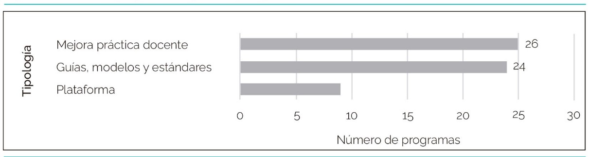 Los programas enfocados en la mejora de la práctica docente promueven, a partir de la observación y reflexión, iniciativas en las que los docentes experimentan mejoras en su práctica. En segundo lugar, los programas tipificados como guías, modelos y estándares son aquellos que proporcionan líneas estratégicas para el desarrollo profesional docente promoviendo los procesos de observación y reflexión sobre la práctica. En su mayoría, estos programas comenzaron siendo aplicaciones prácticas que fueron sistematizadas y convertidas en guías o modelos. Podemos diferenciar dos subtipos en función de su elaboración, aquellos que son construidos a partir de investigaciones y aquellos que son construidos a partir de la experiencia y la fundamentación teórica. En el primero, suelen encontrarse modelos desarrollados por una universidad que buscan obtener un impacto científico. El segundo suele acoger recomendaciones de organismos y administraciones para la mejora del sistema educativo que buscan una incidencia política. Por último, la categoría “Plataforma” suele acoger soportes online que permiten a los docentes compartir prácticas y conocimientos entre sí. Estos espacios virtuales buscan mejorar la práctica profesional a través de la formación continua y la creación de redes profesionales.