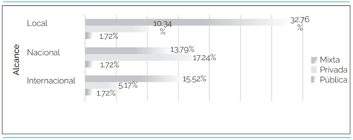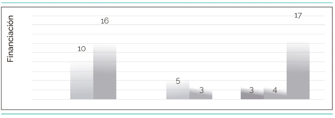 En relación con la financiación encontramos que los programas pueden ser financiados con fondos públicos, privados o de ambos (mixta). En esta última categoría, solo encontramos guías, modelos y estándares, aunque la mayoría de estos programas son financiados con fondos públicos. La financiación de los programas de mejora de la práctica docente está prácticamente repartida entre el ámbito privado y el público, siendo este último levemente superior (ver Figura 2). Por último, las plataformas proceden tanto de la financiación privada como pública. En este sentido encontramos diversos agentes financiadores: organismos supranacionales (3,5 %), administración nacional (20,6 %), administración local (15,5 %), sindicatos (1,7 %), entidad sin ánimo de lucro (19 %), entidad con ánimo de lucro (5,2 %) y universidad (34,5 %).