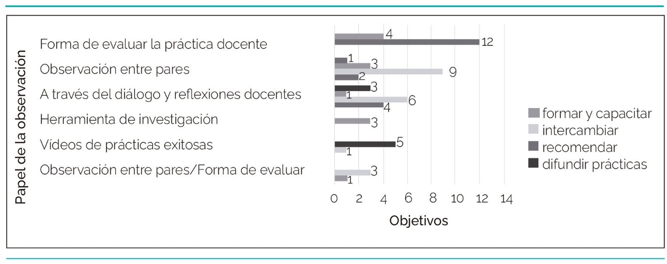 Por un lado, en el caso de la formación inicial, la observación suele ir asociada a la capacitación profesional, ya que es necesario que los futuros docentes desplieguen sus habilidades prácticas en el contexto educativo y cuenten con un mentor que supervise su desempeño a través de la observación y de sesiones de micro-enseñanza (Grádaigh et al., 2021; Juarez & Critchfield, 2021; Kim & Silver, 2021; Manso, 2019; Villalta & Martinic, 2020). Suele desarrollarse en el marco de la asignatura de Prácticum, con el fin de fomentar la competencia reflexiva y el compromiso con la mejora continua desde la formación inicial (Grádaigh et al., 2021; Juarez & Critchfield, 2021; Kim & Silver, 2021; Manso, 2019). Además, entre los objetivos perseguidos, se busca disminuir la distancia entre la investigación y la práctica de aula, impulsar la investigación de aula y mejorar el vínculo entre las universidades y los centros educativos (Domingo, 2020; REDE, 2019; Villalta & Martinic, 2020).