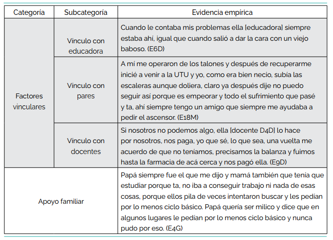 La familia como impulsor del vínculo hacia la institución es otro de los aspectos jerarquizados por los estudiantes en sus relatos. La familia actúa como facilitador u obstaculizador en cuanto al vínculo hacia la institución educativa.