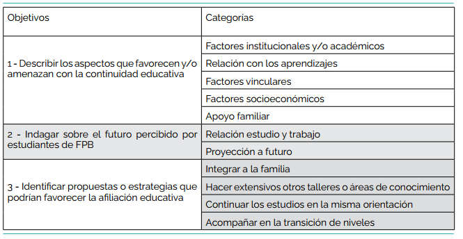 Como parte del análisis se realizó una matriz que permitió organizar la información recabada en base a categorías establecidas a priori, a partir de la teoría a las que se sumaron categorías emergentes. La Tabla 1 muestra las categorías utilizadas, vinculándose a los objetivos específicos de la investigación.