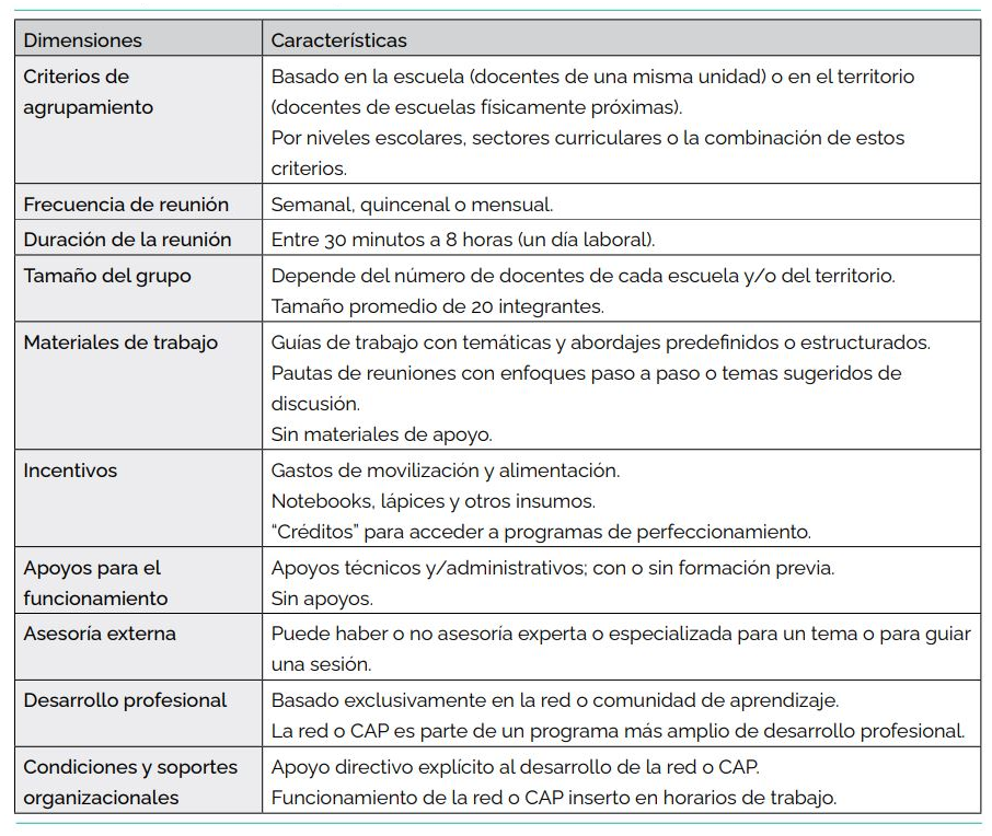 Al ser un dispositivo de política, la red se caracteriza además por: a) el foco en la mejora que vincula las necesidades de los estudiantes con el desarrollo de prácticas docentes; b) el compromiso con el profesionalismo; c) la estructuración formal de las actividades y funcionamiento de la red; d) la reflexión docente basada en la evidencia; e) la incorporación de nuevas prácticas que reemplazan las consideradas inefectivas; y f) el apoyo experto que acompaña este proceso (Soares et al., 2020). Los mismos autores identifican los siguientes elementos o dimensiones de una red, en la Tabla 1: