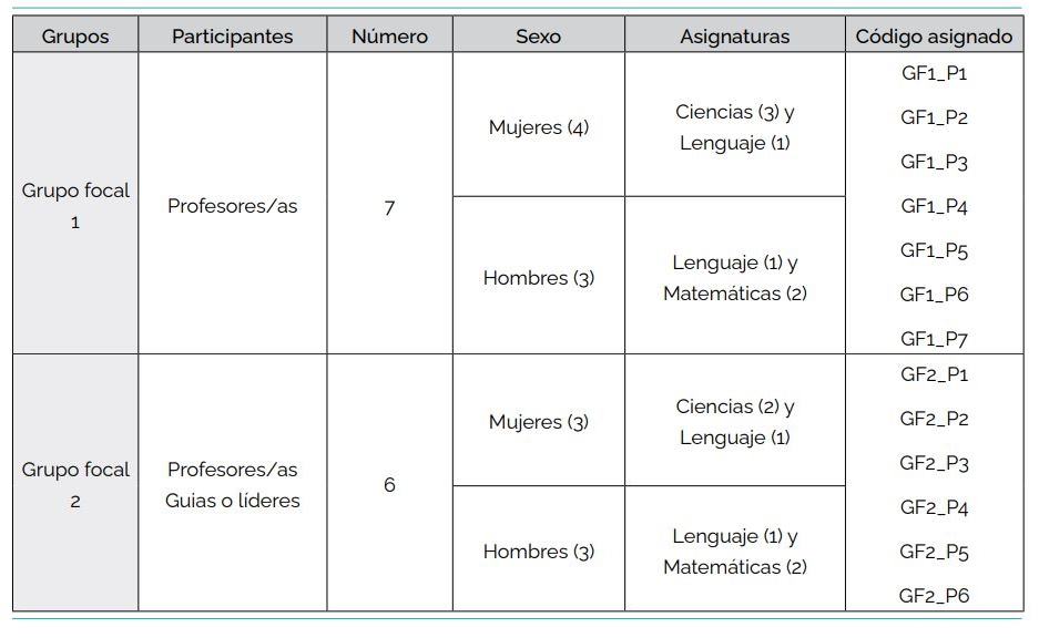 En enero de 2019 se realizaron dos grupos focales con una participación voluntaria e informada de trece profesores, poniendo en contacto diferentes perspectivas, experiencias y puntos de vista (Valles, 2014): un grupo de maestros guías y otro de profesores de asignaturas.