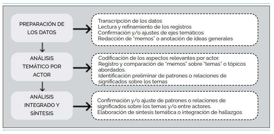 De acá se infiere que existiría una correspondencia entre el contenido de lo comunicado por cada actor y sus disposiciones subjetivas e intereses personales (Andreú, 2002; Flores, 2009). Aunque para el proceso de categorización se tuvo a la vista los criterios metodológicos de la Teoría Fundamentada (Glaser & Strauss, 1967; Strauss & Corbin, 2002), la operación concreta se tradujo en un análisis temático, es decir, en una secuencia de identificación, organización, análisis y formulación de patrones o temas a partir de la lectura y relectura de la información recogida, todo lo cual llevó a inferir resultados que, puestos en diálogo con la teoría, propician una comprensión/interpretación persuasiva del fenómeno en estudio (Braun & Clarke, 2006). A partir de este proceso sedimentaron las siguientes categorías, en la Tabla 3: