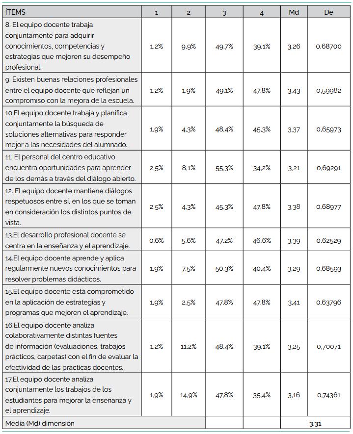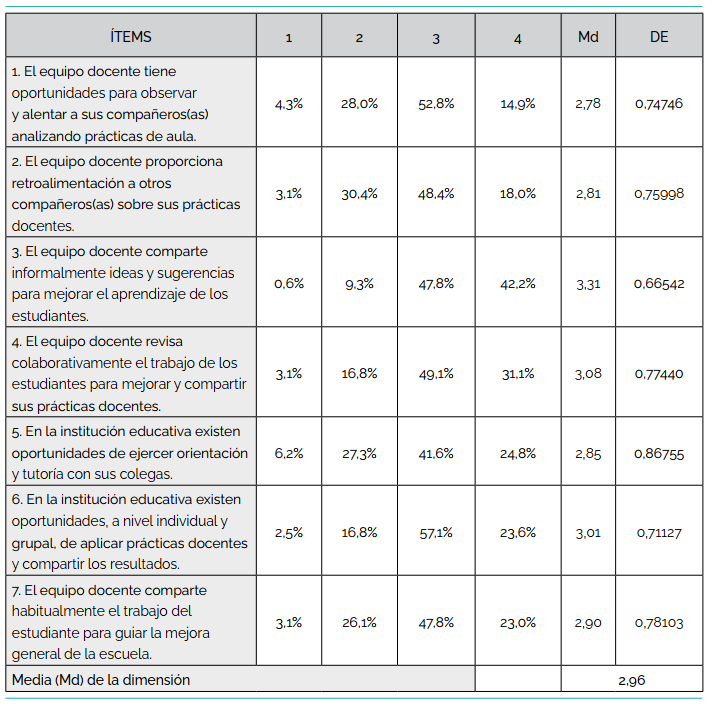 Entre los ítems con mayor acuerdo se encuentra que “El equipo docente comparte informalmente ideas y sugerencias para mejorar el aprendizaje de los estudiantes” (media de 3.3), con un 90,1 % de acuerdo (47,8 %) y totalmente de acuerdo (42,2 %); seguido del ítem N.º 6, en relación a las oportunidades de aplicar prácticas y compartir sus resultados de aprendizaje con una media de 3,01 y un 80,7 % de percepciones distribuidas entre de acuerdo (57,1 %) y totalmente de acuerdo (23,6 %).