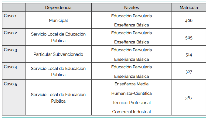 Asimismo, en esta investigación participaron cinco centros educativos chilenos con dependencias distintas (Servicio Local de Educación Pública, Municipales y Particulares subvencionados) con diferentes niveles de enseñanza y matrícula de estudiantes, como se aprecia en la Tabla 1.