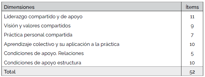 En este estudio se aplicó el cuestionario Professional Learning Communities Assessment-Revised (PLCA-R) en su versión en español (Olivier et al., 2010), considerando, además, la traducción y adaptación al contexto español de Bolívar (2017). El instrumento está elaborado en base a seis dimensiones con 52 afirmaciones (ver Anexo 1) en escala Likert, presentando cuatro niveles: i) Totalmente en desacuerdo; ii) En desacuerdo, iii) De acuerdo; iv) Totalmente de acuerdo.