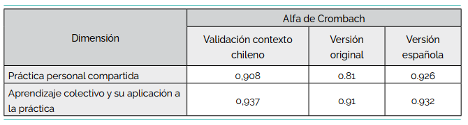 A partir de la validación se ajustaron 44 ítems de los 52 originales del PLCA-R versión en español (Olivier et al., 2010). Para este artículo se consideran los hallazgos de dos de las cinco dimensiones que comprende el instrumento general: Práctica personal compartida (siete ítems) y Aprendizaje colaborativo entre docentes y su aplicación a la práctica (diez ítems); en total, 17 ítems.