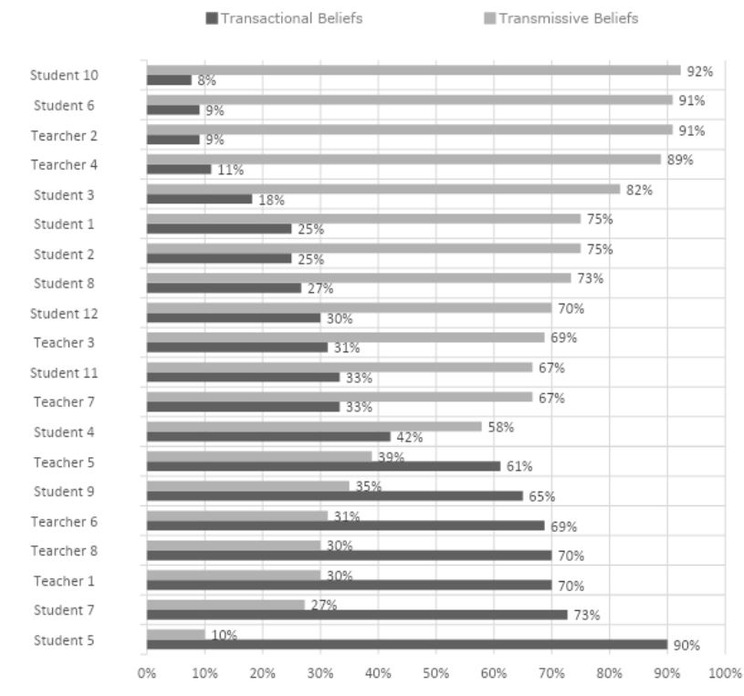 Note. The figure shows percentages of transmissive and transactional beliefs for each participant. Percentages were calculated by adding the codes that each participant had linked to them under each type of belief.
