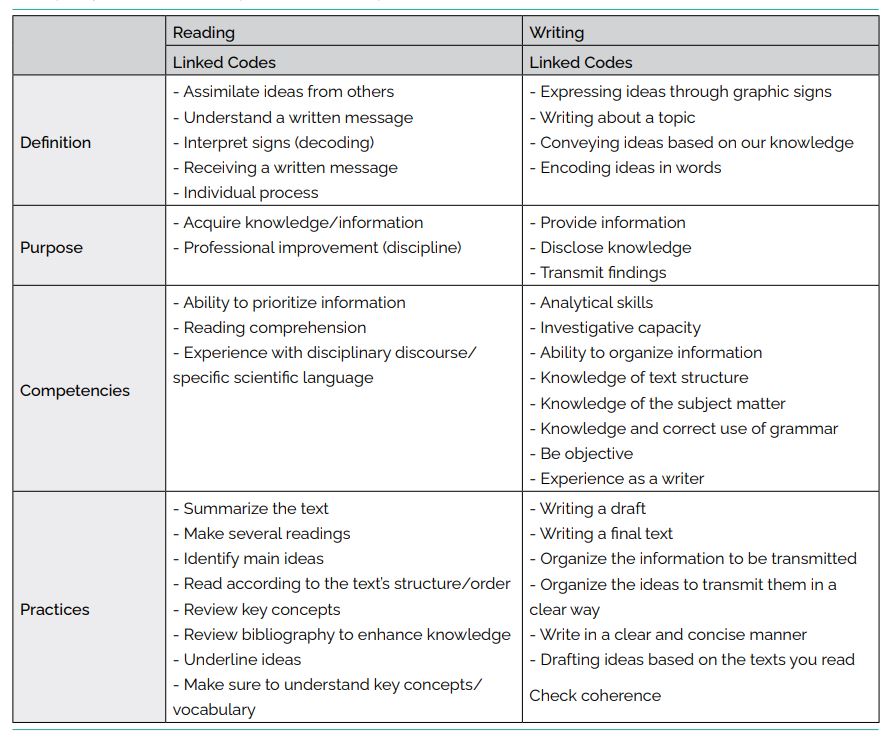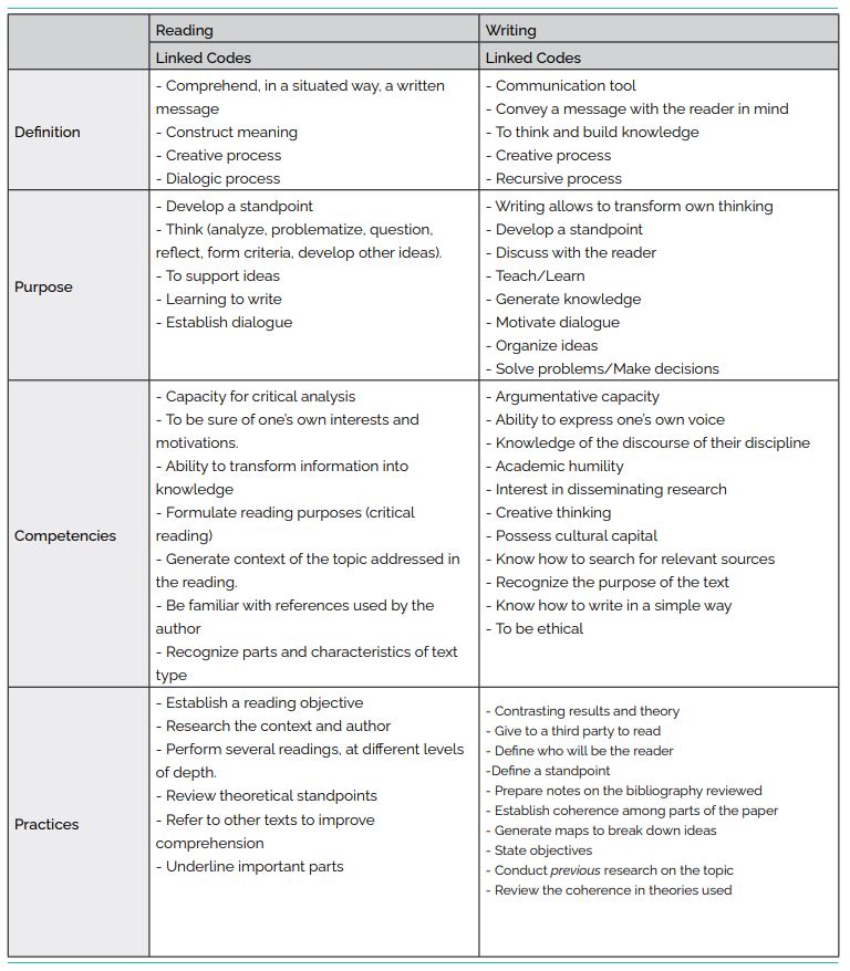 The reading and writing practices examined in this paper are primarily transactional in nature, focusing on aspects such as goal setting, defining a position, inquiring about the author's context, and determining who the reader will be. In other words, they are practices that imply a meta-reflection on what and why one reads and writes, which is inextricably linked to the ways of doing things in a particular academic community. In this sense, it is essential to consider the epistemic nature of reading and writing in the academic context since, as Cassany (2006) points out, reading and writing are recursive processes that involve contrasting and organizing information, ideas, authors, reviewing, re-contrasting and re-reading. This can be corroborated by what teachers and students state about their reading practices, for example: reading other sources to understand a text better; reviewing the bibliography of the text being read to understand the author's position; or conversing with classmates about what they have read, that is, externalizing what they have read in order to learn. In addition, practices in terms of writing include reviewing notes while writing or reading other texts to go deeper into a specific idea and marking the text with different colors in each revision to organize the information coherently. Thus, teachers and students not only read and write to research and generate innovative contributions to their disciplinary field but also learn, converse and develop a position through these practices.