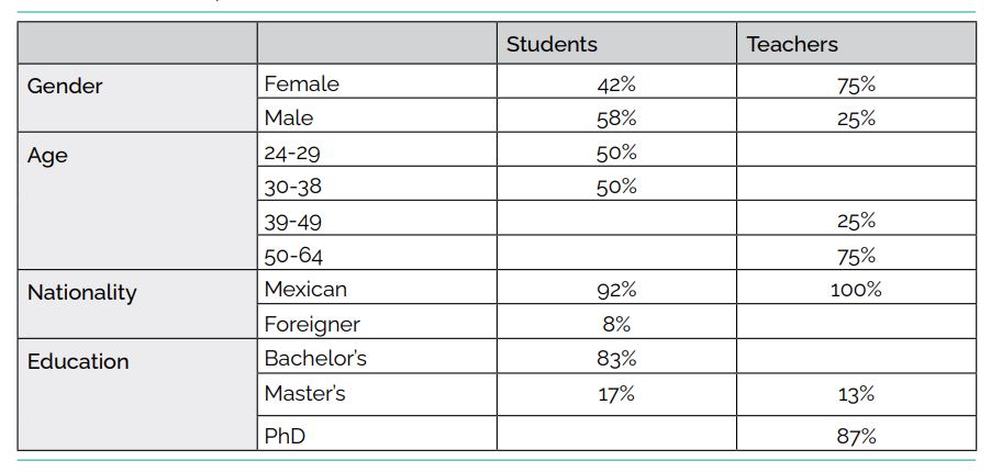 We worked with volunteer subjects from a master's program in Architecture at a public university in Veracruz, Mexico. Collaborating members were 20 in total: 12 students (4 eighth generation and 8 ninth generation) and 8 full-time teachers. Table 1 provides more details on participants.