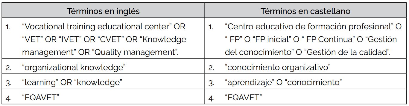 Los documentos seleccionados fueron aquellos que se centran en analizar los procesos, modelos y propuestas de gestión de la calidad y gestión del conocimiento en la FP. En el caso de los informes y artículos de investigación, se han contemplado tanto aquellos que abordan el objeto de estudio desde planteamientos cuantitativos, como cualitativos o mixtos, considerando así diferentes posibles aproximaciones y formas de estudiar la gestión de la calidad y la gestión del conocimiento en la FP. Asimismo, se han contemplado también las propuestas teóricas que contribuyen a una mejor comprensión del fenómeno.