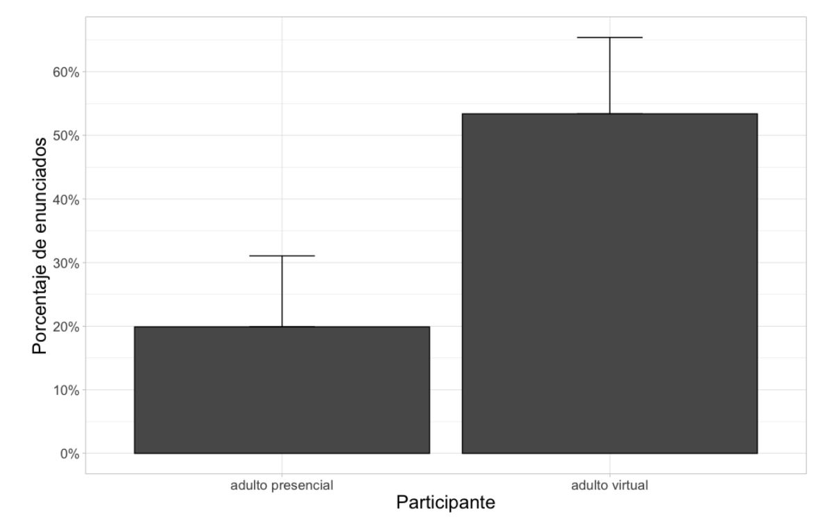 Por otra parte, el análisis mostró una mayor presencia de emisiones producidas por adultos virtuales en la orientación de las narrativas. Muchas de ellas contribuyen con la construcción del marco de la narración al solicitar mayor contextualización por parte de los niños para asegurar la comprensión del relato. Asimismo, se observó que otras intervenciones del adulto virtual que buscan reparar fallas técnicas de la comunicación también se concentran en la orientación, así como en la complicación, lo que sugiere la relevancia de estas partes del relato para construir el sentido global de la narrativa.
