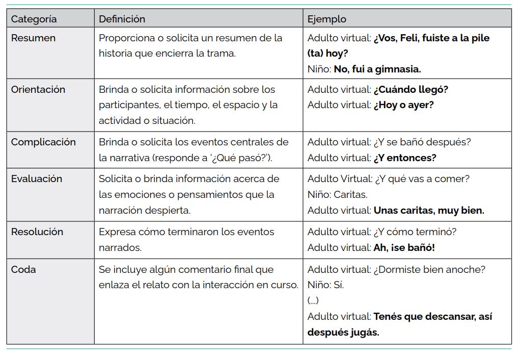 Al igual que estudios previos realizados en contextos cara a cara (Brown & Bellugi, 1964; Nelson, 1977; Rosemberg & Silva, 2009; entre otros), en este trabajo se identificaron distintas estrategias que los adultos ponen en marcha para andamiar la producción narrativa infantil. Mientras los niños relatan sus experiencias por medio de dispositivos electrónicos, los adultos reestructuran, expanden y reconceptualizan las emisiones infantiles, solicitan información sobre aspectos principales de la narrativa —tales como la identificación de los participantes—, enfatizan información otorgada por el niño, entre otras.