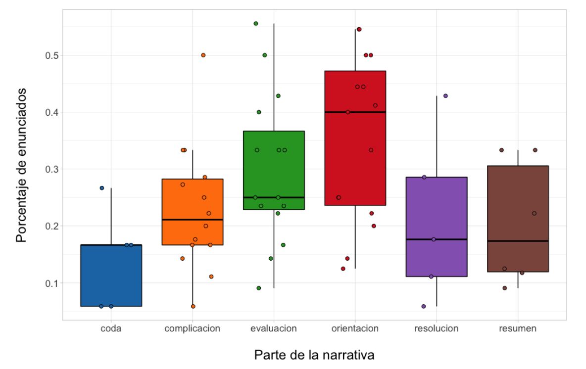 Siguiendo a Labov (1972, 2010), la estructura de las narrativas de experiencia personal se establece por la existencia de una coyuntura temporal entre dos cláusulas independientes que, en este caso, conforman cláusulas narrativas —esto es, que responden a la pregunta "¿qué pasó entonces?"— y constituyen la complicaciónii de la acción de la narración. El autor distingue los siguientes componentes estructurales de los relatos: resumen, orientación, complicación, resolución, coda y evaluación. El resumen proporciona una breve síntesis de la historia que se va a desarrollar. La orientación posee una función referencial en tanto allí se ubica la información acerca de quiénes son los participantes, el espacio y el tiempo en los que ocurrieron los eventos en la historia. La complicación constituye el elemento central o esqueleto narrativo del relato —donde se expresa qué ocurrió—, sin ella no hay narrativa. Tras la aparición de este suceso inesperado, el o los eventos que siguen conforman la resolución del conflicto. Los relatos también suelen presentar evaluaciones de los hechos narrados, en las que se suspende la trama y se exteriorizan los pensamientos, juicios y valoraciones del narrador frente a los sucesos (Labov, 1972, 2010; Labov & Waletzky, 1967). Finalmente, los relatos contienen algún comentario final o coda —por ejemplo, "se acabó", "esto es todo"—, que generalmente enlaza la narración con la interacción que se está dando en el presente.
