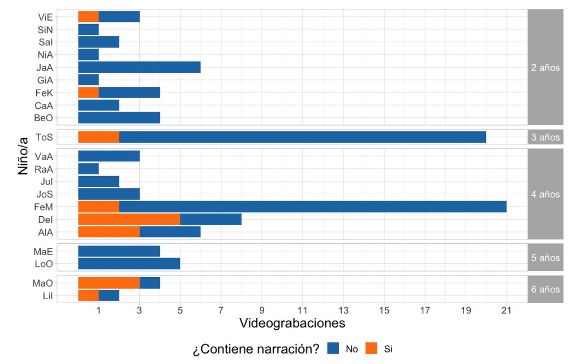 Para responder (a), en §1.4, se identificaron las videograbaciones que contenían secuencias narrativas (Labov, 1972) producidas por los niños. Para caracterizar estas secuencias, la tercera autora determinó si se empleaban con el propósito de compartir experiencias pasadas —narrativas personales— (Fernández & Melzi, 2008; Nelson, 1996), planificar eventos futuros —narrativas futuras— (Hudson, 2006) o compartir eventos ficcionales —narrativas de ficción— (Nelson, 1996). Por otra parte, las narrativas fueron categorizadas como heterorreguladas, de regulación compartida y autorreguladas por la cuarta autora, según el grado de participación del adulto en la construcción del relato infantil. Adicionalmente, la quinta autora especificó si involucraban interacciones sincrónicas —en las que los interlocutores participaban al mismo tiempo— o asincrónicas —los interlocutores participan en distintos momentos, por ejemplo, cuando el niño grababa un mensaje para que otro lo escuche posteriormente—. Por último, la sexta autora indicó si la tecnología mediaba la comunicación con otras personas, o bien era empleada por el niño con otros fines, por ejemplo, jugar solo.