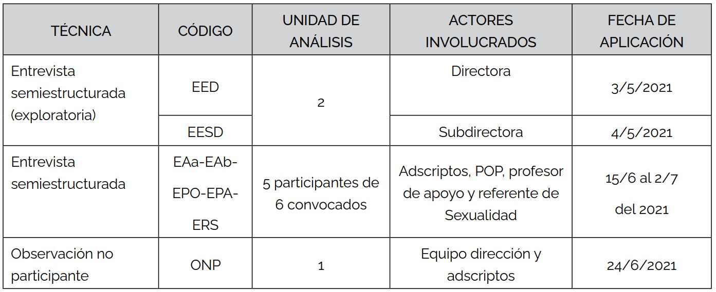 Durante esta fase, la técnica empleada fue la entrevista exploratoria a la directora y a la subdirectora de la organización. La intención estaba centrada en conocer sus particularidades, las formas de organización, así como identificar la demanda. La situación de emergencia sanitaria impidió realizar estos encuentros en el liceo, pues el ingreso de personas estaba restringido. Por este motivo, ambas entrevistas se realizaron mediadas por la tecnología, utilizando el servicio de videoconferencias de Zoom y en forma individual.