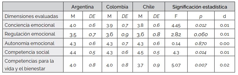 De acuerdo al test F, se reportan diferencias estadísticamente significativas en conciencia emocional (F = 4.45, p = 0.012) con un tamaño del efecto pequeño (η² = 0.01). En esta dimensión, los estudiantes argentinos reportan mayores puntuaciones. Del mismo modo, en competencia social se reportan diferencias estadísticamente significativas (F = 4.3, p = 0.014 con un tamaño del efecto pequeño (η² = 0.01). Cabe destacar que, en esta dimensión, las diferencias se dan entre los tres grupos, siendo el grupo de estudiantes chilenos el que obtiene la puntuación media mayor y el del grupo de colombianos, la menor puntuación. Finalmente, también se encuentran diferencias estadísticamente significativas en la dimensión competencias para la vida y el bienestar (F = 5.1, p = 0.007) con un tamaño del efecto pequeño (η² = 0.02). En este caso son los estudiantes chilenos quienes obtienen una puntuación media, significativamente menor.