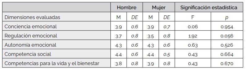 Los indicadores que diferencian las autopercepciones de hombres y mujeres participantes de este estudio son: el 6, perteneciente a la dimensión de regulación emocional, ítem en el que los hombres, en promedio, puntúan más alto que las mujeres; el ítem 11 de autonomía emocional, en el que las mujeres puntúan más alto; y los ítems 15 y 16, pertenecientes a la dimensión de competencia social, en caso del ítem 15 son los hombres quienes obtienen puntuaciones más altas y en el 16, las mujeres (véase Tabla 3).