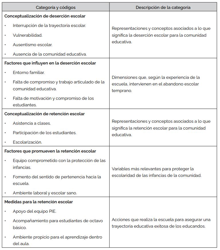 Una posible hipótesis del por qué emergieron estos temas en la comunidad educativa estudiada es que el término “deserción” podría tener una carga conceptual, en sí misma, más individual o que enfatiza —en mayor medida— las responsabilidades del estudiante, frente a lo cual, algunos autores han preferido los términos “desescolarización” o “exclusión escolar” (Portales et al., 2019). Próximos estudios podrían indagar en cómo se comprende este concepto, en particular en otras comunidades educativas. Más allá de esta precisión, cuando la comunidad educativa analiza los factores que producen la deserción escolar en la enseñanza primaria, no se quedan únicamente en el nivel individual, sino también mencionan elementos sociofamiliares y reflexionan acerca de su propio rol.