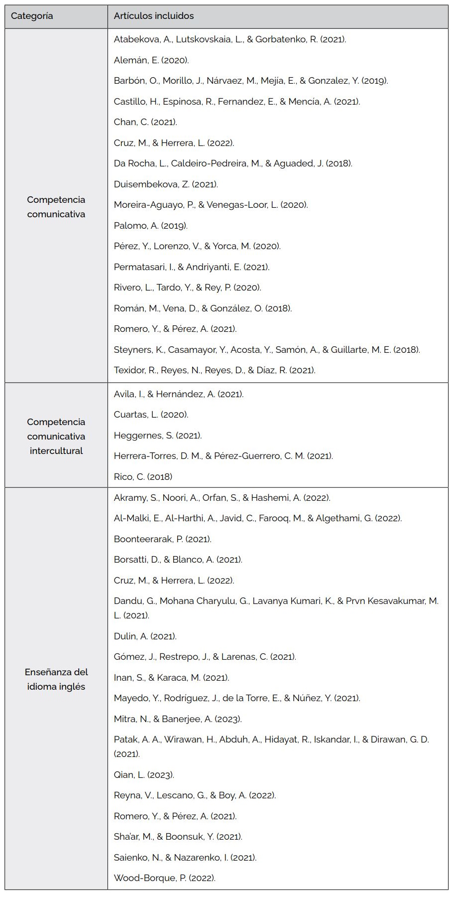 La Tabla 3 muestra la data obtenida en la presente investigación, la cual fue priorizada manteniendo una secuencia lógica que comprende publicaciones desde el 2018 al 2023; revistas educativas y científicas de alto impacto, autores reconocidos con una vasta experiencia en investigación y publicación de artículos; además de la estructura de los títulos relacionada con competencia comunicativa, competencia comunicativa intercultural y enseñanza del idioma inglés.