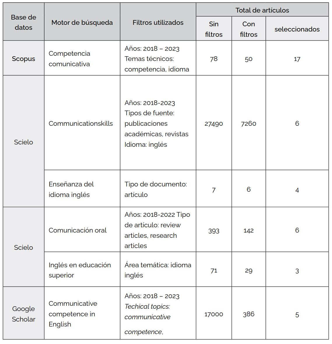 La información presentada en la Tabla 2 da a conocer la cantidad de artículos encontrados al inicio de la investigación, seleccionando los más pertinentes y filtrando palabras vinculadas al estudio, tales como competencia comunicativa, communication skills, enseñanza del idioma inglés, comunicación oral, inglés en educación superior y communicative competence in English. A fin de disminuir la proporción inicial de los estudios seleccionados, se priorizaron las investigaciones publicadas en Scopus, Scielo y Google scholar, por ser las bases de datos de mayor rigor científico; además se tuvo en cuenta el año de publicación (desde el 2018) y las áreas de investigación.