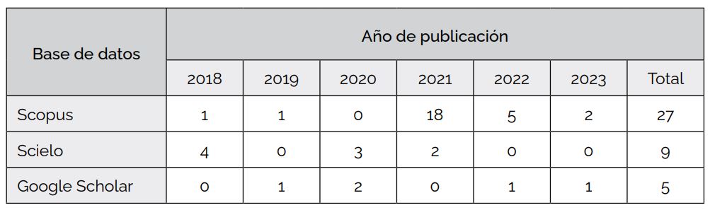 La Tabla 1 detalla el análisis reflexivo de 41 artículos de mayor impacto indexados en Scopus, Scielo y Google scholar. Dichos artículos fueron seleccionados minuciosamente, considerando ciertas pautas como el año de publicación, el cual comprende a partir del año 2018 hasta el 2023; área, idioma; entre otros. Teniendo como resultado final la revisión de 27 estudios de investigación en Scopus, 9 artículos en la base de datos Scielo y por último 5 investigaciones obtenidas de Google Scholar.