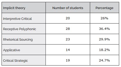 The scale asks students to read 25 items that complete the statement “I believe effective reading comprehension involves...” For each item, they must choose between 1 (strongly disagree) and 5 (strongly agree) to show their level of agreement or disagreement with the resulting proposition. For example, item 17 would be read as “I believe effective reading comprehension involves contrasting the message of the text with those of other related texts.” A respondent who chooses options 4 (agree) or 5 (strongly agree) shows adherence to this belief, which is a part of the Rhetorical IT. By contrast, a respondent who chooses a number between 1 and 3 is not considered to hold this belief. It is important to note that, unlike other implicit theory instruments, the ETICOLEC does not elicit beliefs about texts' functions or readers' roles. Therefore, its usefulness is restricted to exploring readers’ beliefs about comprehension itself. Of course, participants’ ideas about readers’ processes can be inferred from their answers, but they are not the main focus of the ETICOLEC.