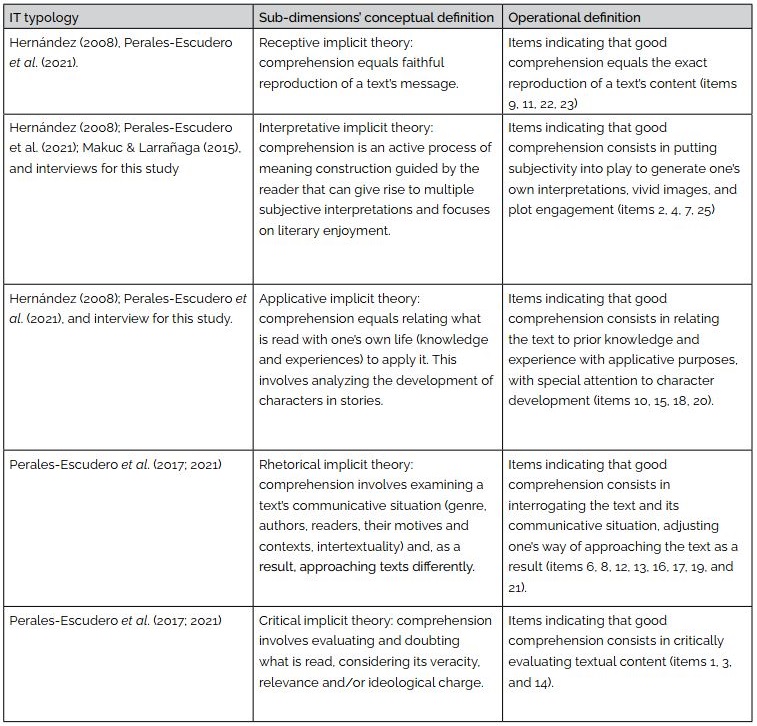 Reading ITs have been explored using different theoretical approaches and instruments. Some studies have used Likert scales (Makuc & Larrañaga, 2015; Lordán et al., 2015), and others have used interview protocols (Hernández, 2008; Moore & Narciso, 2011; Perales-Escudero et al., 2017). In general, they rely on and find a three-part taxonomy of ITs.
