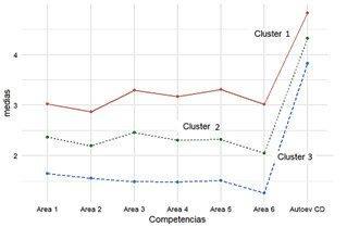 Se observa en el clúster 1, a la derecha de la figura, el grupo de docentes con las mejores puntuaciones promedio en todas las áreas competenciales y en el clúster 3, a la izquierda, con las puntuaciones medias más bajas.