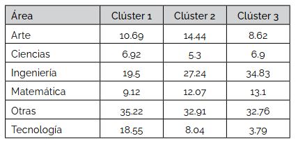 los clústeres 1 y 2, las áreas no STEAM (Otras) son las que mayor