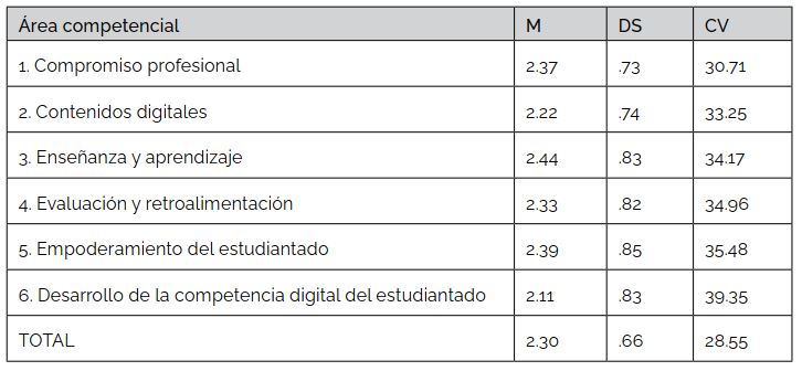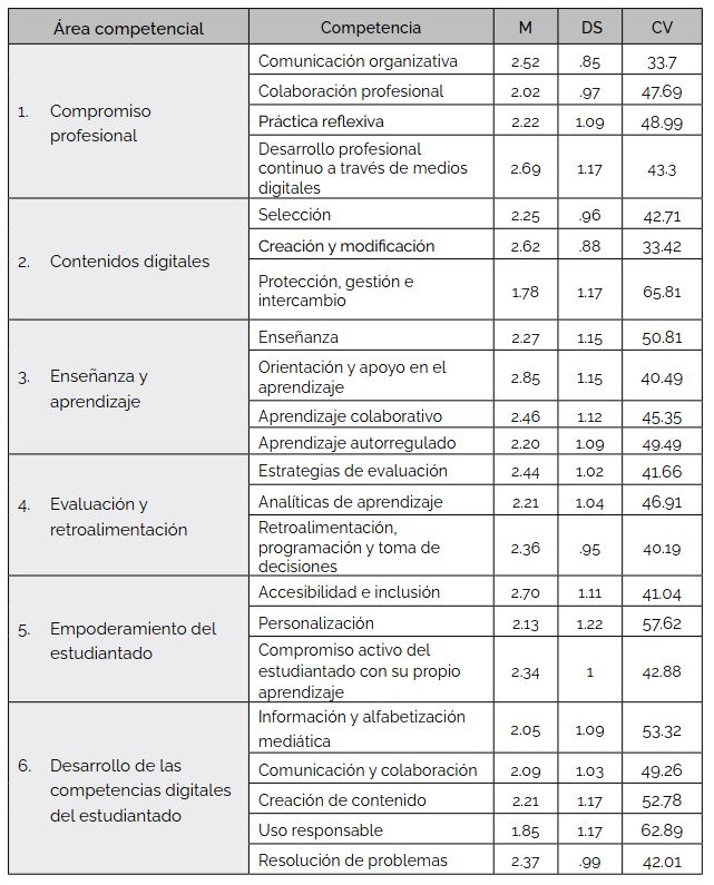 Así, dando respuesta al primer objetivo propuesto en el trabajo, se observa que, previo a la indagación específica en las áreas competenciales, la mayoría del grupo encuestado se asigna puntuaciones de ACDD equivalentes, en promedio, a los niveles competenciales ubicados entre Experto y Lider. El resultado obtenido en esta investigación estaría vinculado con una idealización respecto de su ACDD en coincidencia con las afirmaciones de Cabero-Almenara, Barroso-Osuna, Rodríguez-Gallego et al. (2020).