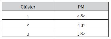 ostenta los puntajes medios más altos, mientras que el clúster 3,