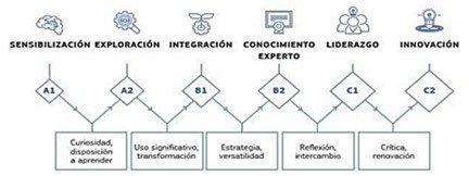 En los dos primeros niveles (A1-A2), el profesorado explora y desarrolla prácticas básicas; en los siguientes (B1-B2), integran, amplían y reflexionan sobre su quehacer educativo y, en las dos últimas (C1-C2), transfieren conocimientos y juzgan en forma crítica la práctica (Redecker, 2020).