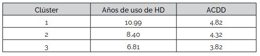 La Tabla 7 compara, por clúster, la antigüedad promedio en el uso de HD con el puntaje promedio de la ACDD.