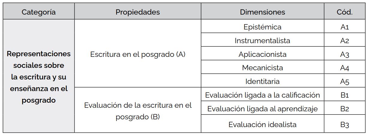 La administración de las entrevistas fue posible gracias a la colaboración de las autoridades académicas de la facultad, que habilitaron el acceso y facilitaron datos para contactar a los participantes. El diseño de análisis fue elaborado con base en la Teoría Fundamentada (Strauss & Corbin, 1998), dado que el proceso de conceptualización procede de los datos resultantes en la investigación. Luego de identificar y relacionar categorías centrales en la información relevada, aplicamos el método de comparación constante, de la teoría con los resultados tanto como al interior de estos últimos. La Tabla 1 sistematiza los datos empíricos en categorías, propiedades y dimensiones. Las categorías conforman conceptos derivados de los datos que representan el fenómeno. Las propiedades constituyen atributos de esa categoría y las dimensiones representan la localización de cada propiedad durante un continuo, cuyo rango de variación permitió aumentar el conocimiento en torno a las representaciones sociales sobre la escritura y su evaluación.