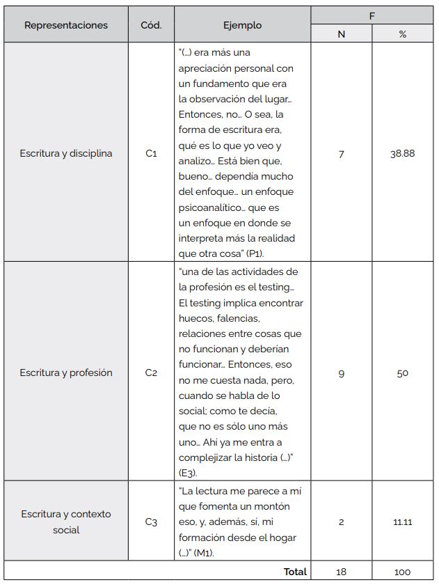 Con respecto al objetivo 2 de este trabajo, relativo a las características de las trayectorias en el posgrado (Tabla 5), observamos que sus representaciones sobre la escritura varían de acuerdo con sus experiencias en torno a esta práctica. Estas últimas no solamente se vinculan con la disciplina (medicina, enfermería, terapia ocupacional, veterinaria, psicología e ingeniería), sino también con la profesión que ejercen y el contexto social en donde se circunscriben. De un total de 18 ocurrencias, 7 respuestas (38.88 %) asociaron la escritura con la disciplina en sus carreras de grado (C1). A su vez, 9 respuestas (50 %) otorgan relevancia al ejercicio profesional de la escritura (laboral, docente, investigativo) luego de graduarse (C2). Por último, en dos ocasiones (11.11 %) se aludió al contexto social en que se circunscriben y/o lo hicieron en el pasado.