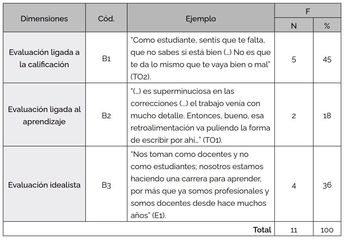 Esas percepciones derivan de representaciones hegemónicas en torno a la evaluación (B1, Tabla 4): “Escribís mucho para que alguno te diga que está bien… y… (risas)” (E1). “Como estudiante, sentís que te falta, que no sabés si está bien; a la vez de que uno tiene la vergüenza, o sea, más seriedad… No es que te da lo mismo que te vaya bien o mal” (M2). “Siempre que hay un otro leyéndote con otros ojos de… o sea, mirando tu redacción... es otro aprendizaje (...) Es un poco volver a sentirse evaluado, también tiene otra connotación, es otro peso” (TO2). Las representaciones subyacentes aquí, escribir para ser aprobadas, expresan una agencia en el discurso y comprenden la escritura como un producto final para ser calificado.