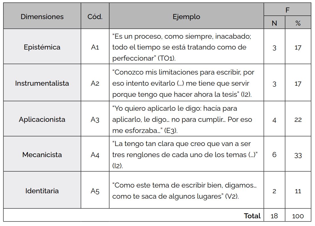 Es por eso que ayudar a construir identidad discursiva requiere valorar el proceso del propio estudiante y, en ese recorrido, identificar sus representaciones acerca de la escritura. Esta tarea no está exenta de dificultades porque el imaginario social es heterogéneo por naturaleza. Mientras en algunos cursantes persiste una idea procesual —que guarda consigo una concepción epistémica de la escritura— (“es un proceso, como siempre, inacabado; todo el tiempo se está tratando como de perfeccionar”) (TO1) (A1, Tabla 3), en otros aparece una idea mecanicista: “la tengo tan clara que creo que van a ser tres renglones de cada uno de los temas. Entonces, cuando presente mi tesis van a ser cinco, va, el Plan de Tesis fueron doce hojas, y yo la tesis… treinta (risas)” (I2) (A4, Tabla 3).
