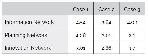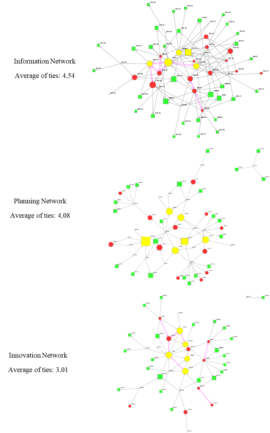 After analyzing the three types of networks for each case, it is possible to appreciate that there is a relationship between the levels of the centers identified in Stage 1 (high, medium, and low) and the number of ties identified in the different networks. Even though the center classified as low-level has a high number of ties in the information network, in the planning and innovation ones, it is clearly appreciated that there is a higher number of ties in the center classified as high-level, followed by the medium-level one, and last, the low-level one (Table 4).