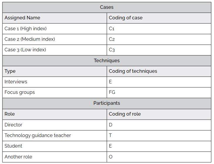 Finally, a focus group in each teacher education center was conducted, with a total of 19 participants. The script for the focus group incorporated the following topics: digital technologies, professional learning communities, and innovation. This technique was also conducted via video conferencing due to the suspension of in-person instruction in all educational centers and the health protocols in force in the country. The transcription of the interviews and focus groups were processed in Atlas.ti, considering the dimensions mentioned above. The strategy for data analysis presented proposes the comparison of the three chosen cases. Table 1 shows the code and techniques for each case, according to the involved stakeholders.