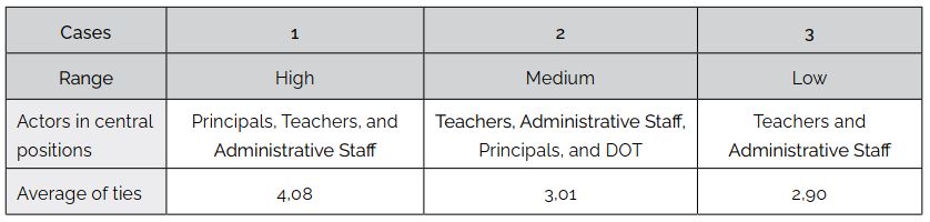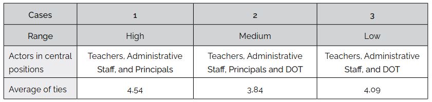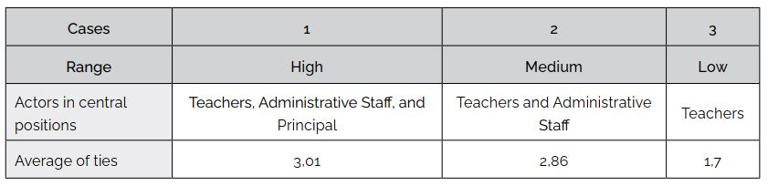 Evidence shows that it is possible to appreciate professional communities, even incipient ones. They are present in the information networks of the three centers that show a high level of cohesion given by the number of ties per person and the network density. Another aspect is the diversity of the type of actors in the different networks since, in no case is this limited only to teachers.